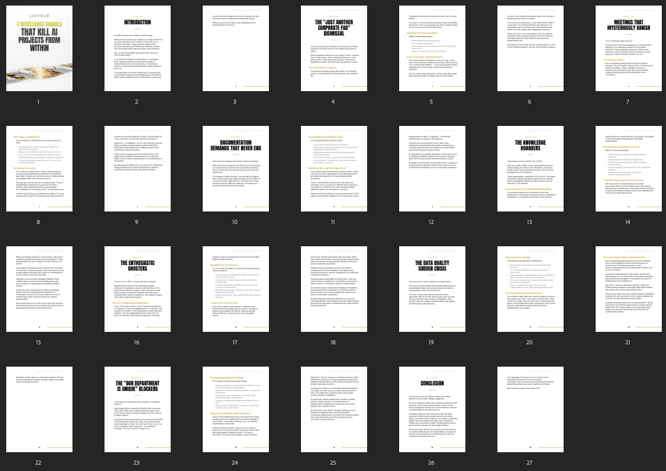 This listicle is a ready-to-use content asset designed to quickly educate, engage, and qualify your audience with skimmable, high-value insights. It’s perfect for resellers who want to offer a practical lead magnet that builds awareness around AI transformation without overwhelming the reader. With a strong, clear narrative and 7 powerful signals, it shows your customers how to spot and stop internal resistance before it silently kills AI projects.